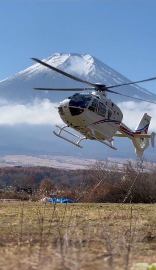 離着陸場所の確保や、機体や要員の確保、お客様のご予算のクリアなど、実に多くの難題を、自治体さんや事業者さんの協力を頂きながら、実現に漕ぎつけました。私たちの思いが天に通じたのか、フライトに絶好のお天気に恵まれ、ゲストの皆さまも、忍野ヘリポートに着くなり、待機していたスタッフに喜びのあまり抱き着いて「Thank you!」を連発されるなど、大喜びされていました。